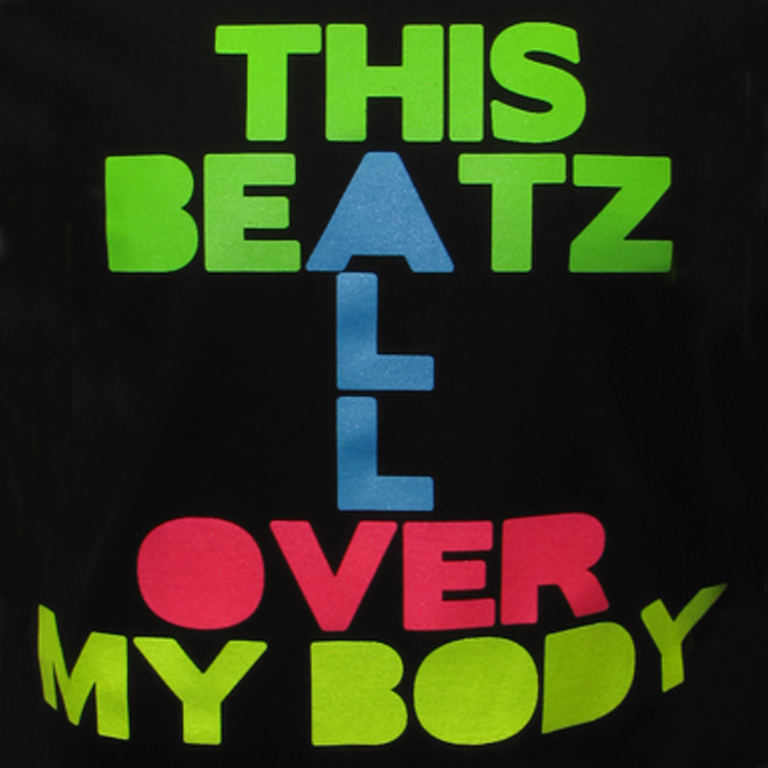 Electric Beatz Fashion Fit BLACK T-Shirt from Twisted Beak. Featuring This Beatz All Over My Body slogan print in UV colour on front of t-shirt, with Twisted Beak name and logo on reverse. Twisted Beak arm label. Custom back neck label. 100% soft cotton.