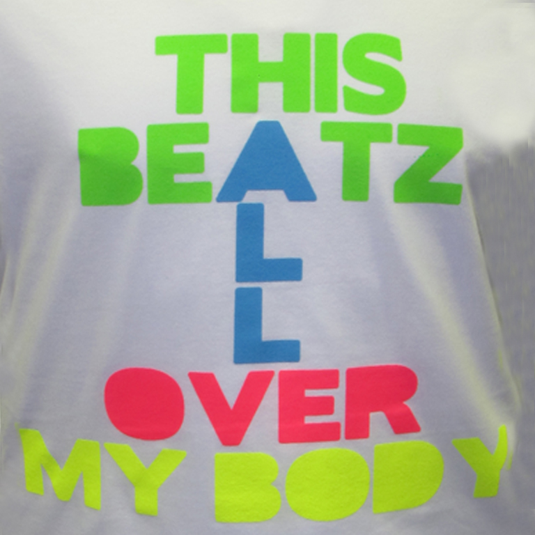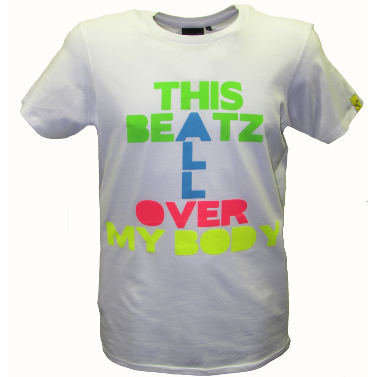 Electric Beatz Fashion Fit WHITE T-Shirt from Twisted Beak. Featuring This Beatz All Over My Body slogan print in UV colour on front of t-shirt, with Twisted Beak name and logo on reverse. Twisted Beak arm label. Custom back neck label. 100% soft cotton.